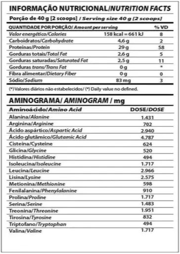 Proteína concentrada do soro de leite, aromatizante e edulcorante sucralose. ALÉRGICOS: CONTÉM DERIVADOS DE LEITE E SOJA*. *Ingrediente utilizado no processo de fabricação da proteína do soro de leite com função de instantaneização. NÃO CONTÉM GLÚTEN. CONTÉM LACTOSE.