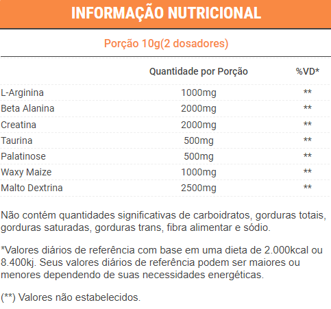 L-Arginina, beta alanina, creatina, palatinose, waxy maize, maltodextrina, edulcorante xilytol e aromatizante.