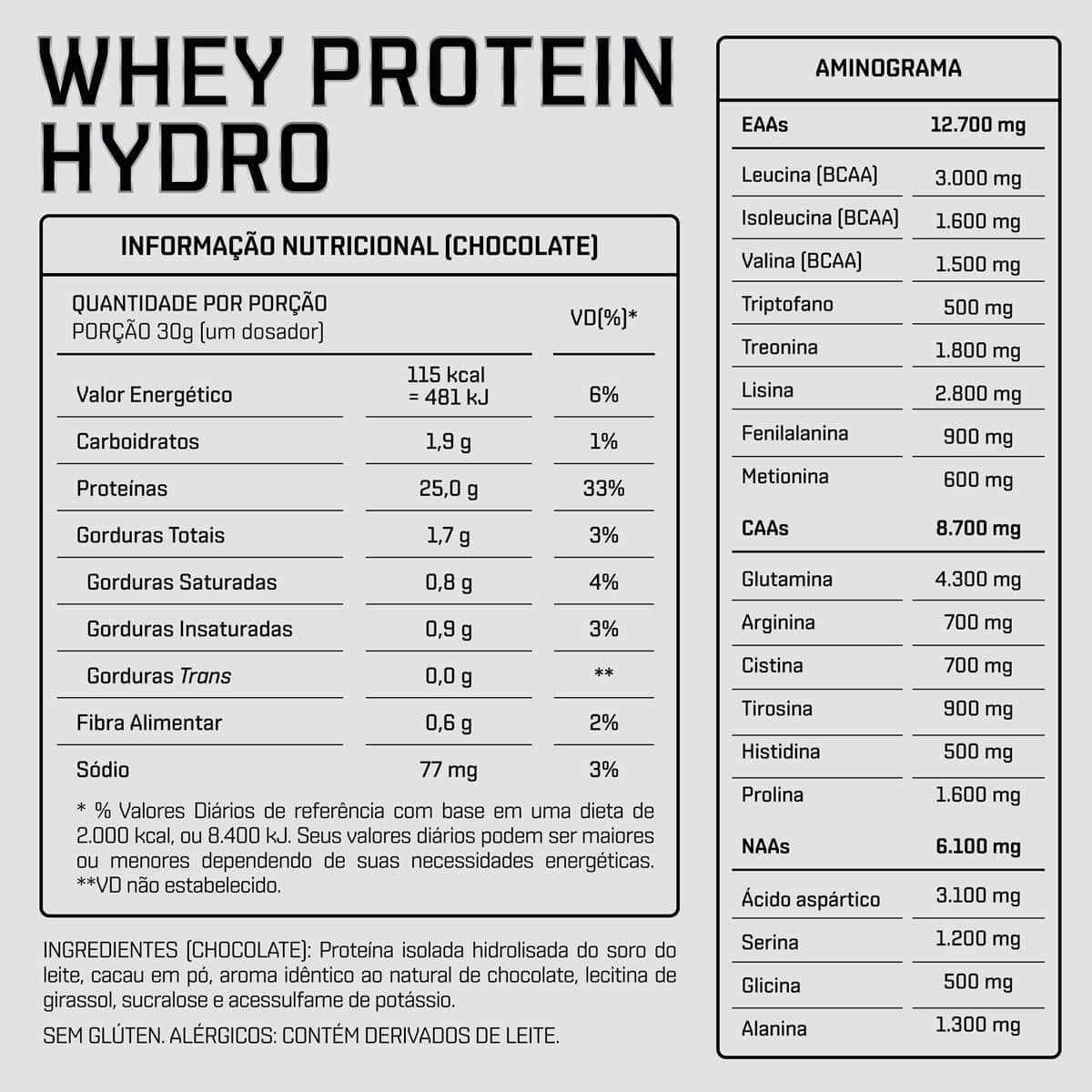 Proteína hidrolisada do soro do leite, cacau em pó, aroma idêntico ao natural de chocolate, lecitina, sucralose e acessulfame de potássio. CONTÉM LACTOSE. SEM GLÚTEN.